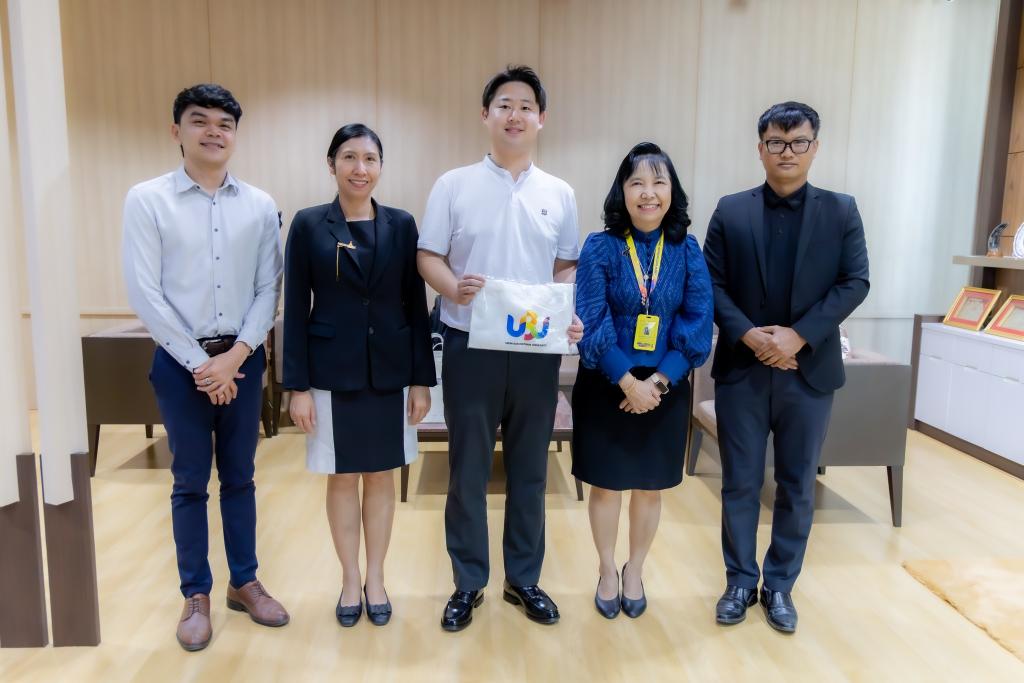 抵达乌汶大学后,该校校长 Dr.Chutinun Prasitpuriprecha 携团队热情接待。Dr.Chutinun Prasitpuriprecha 对郑斌科长的到访表示热烈欢迎,对两校合作满怀期待。她简要介绍了乌汶大学概况,高度肯定我校办学成果与社会声誉,指出双方在多领域具备合作潜力,此次来访意义重大,开辟了合作新路径,期望挖掘更多务实合作项目,深化交流合作。