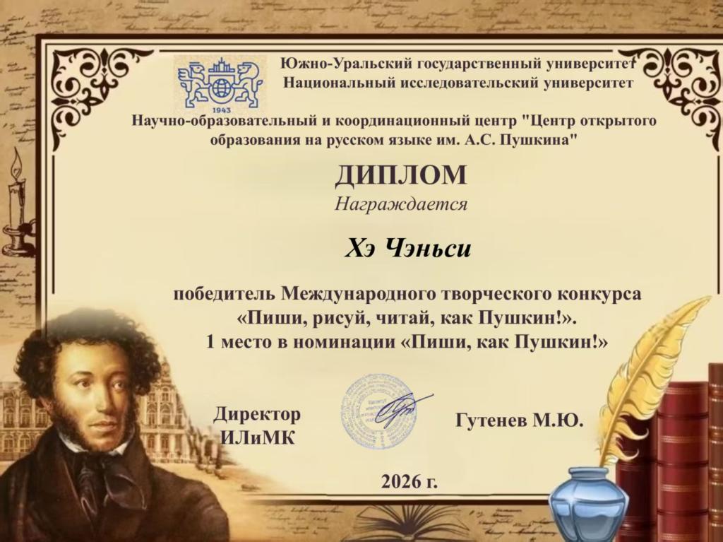 寒假期间,俄罗斯南乌拉尔国立大学举办了以纪念普希金为主题的《画普希金肖像,书写、朗诵普希金作品》国际竞赛,赛事吸引了俄罗斯、中国、哈萨克斯坦三国100余名选手同台竞技。我校国际教育学院俄语教研室教师积极组织学生参与此次赛事,多名学子在不同赛道脱颖而出、斩获荣誉。